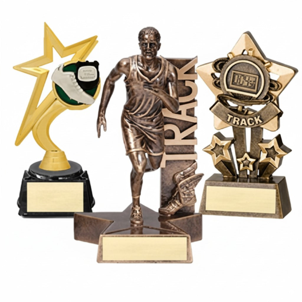 Explore our complete range of customizable sports awards, featuring glass awards, column trophies, resin trophies, and personalized medals.