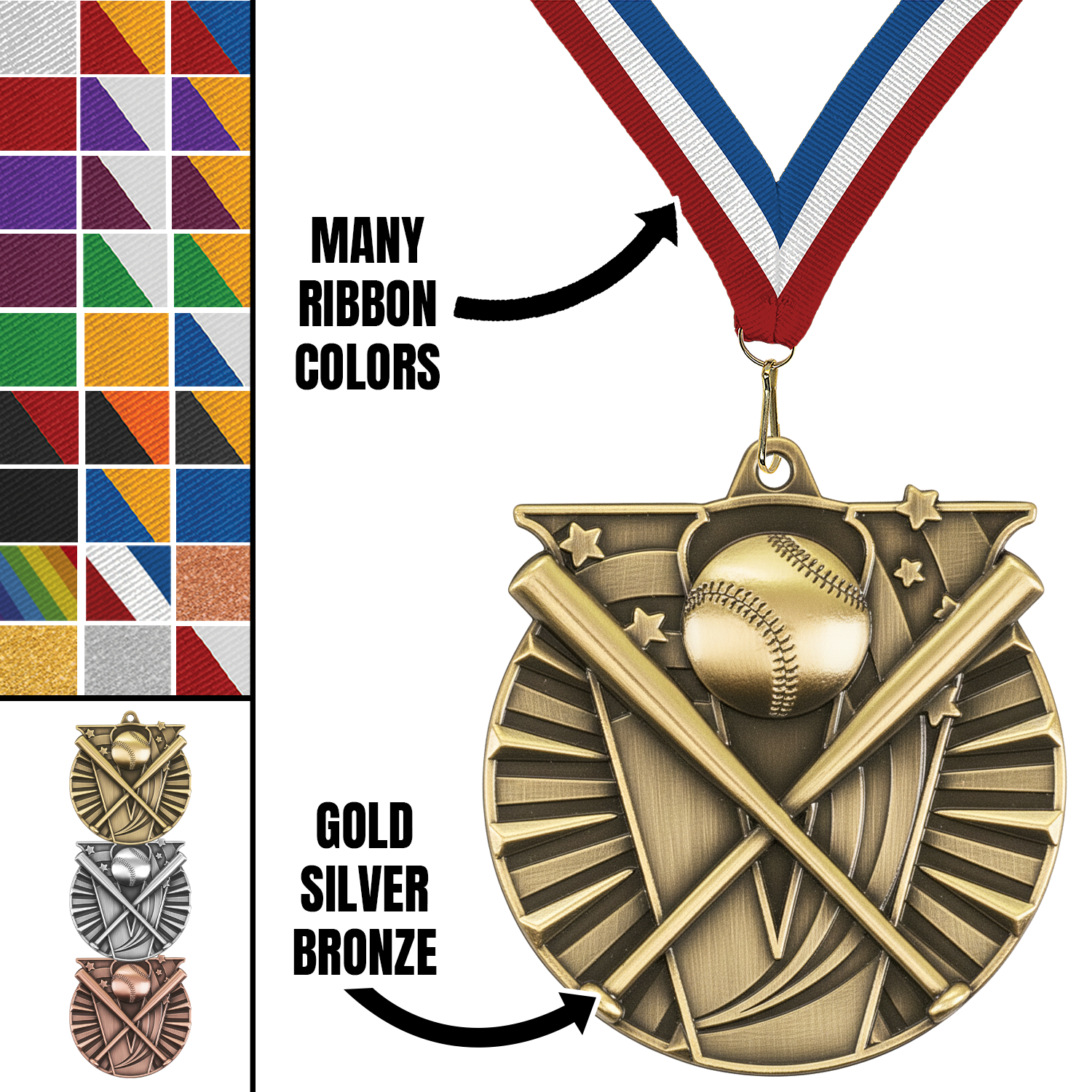 2" Victory Softball Medal – Gold, Silver & Bronze with Custom Ribbons in 30 Colors