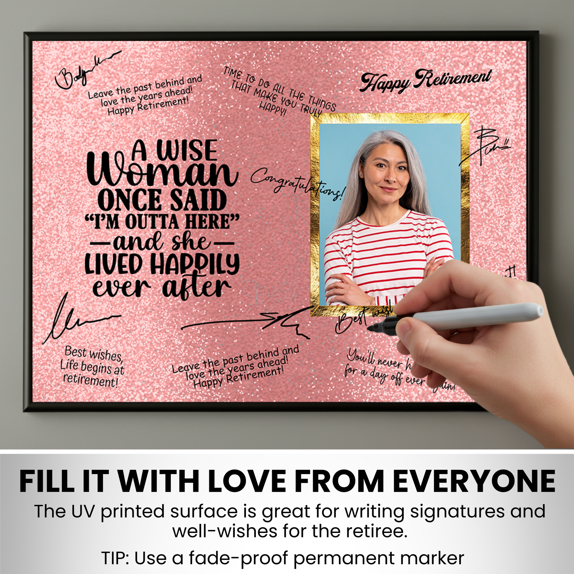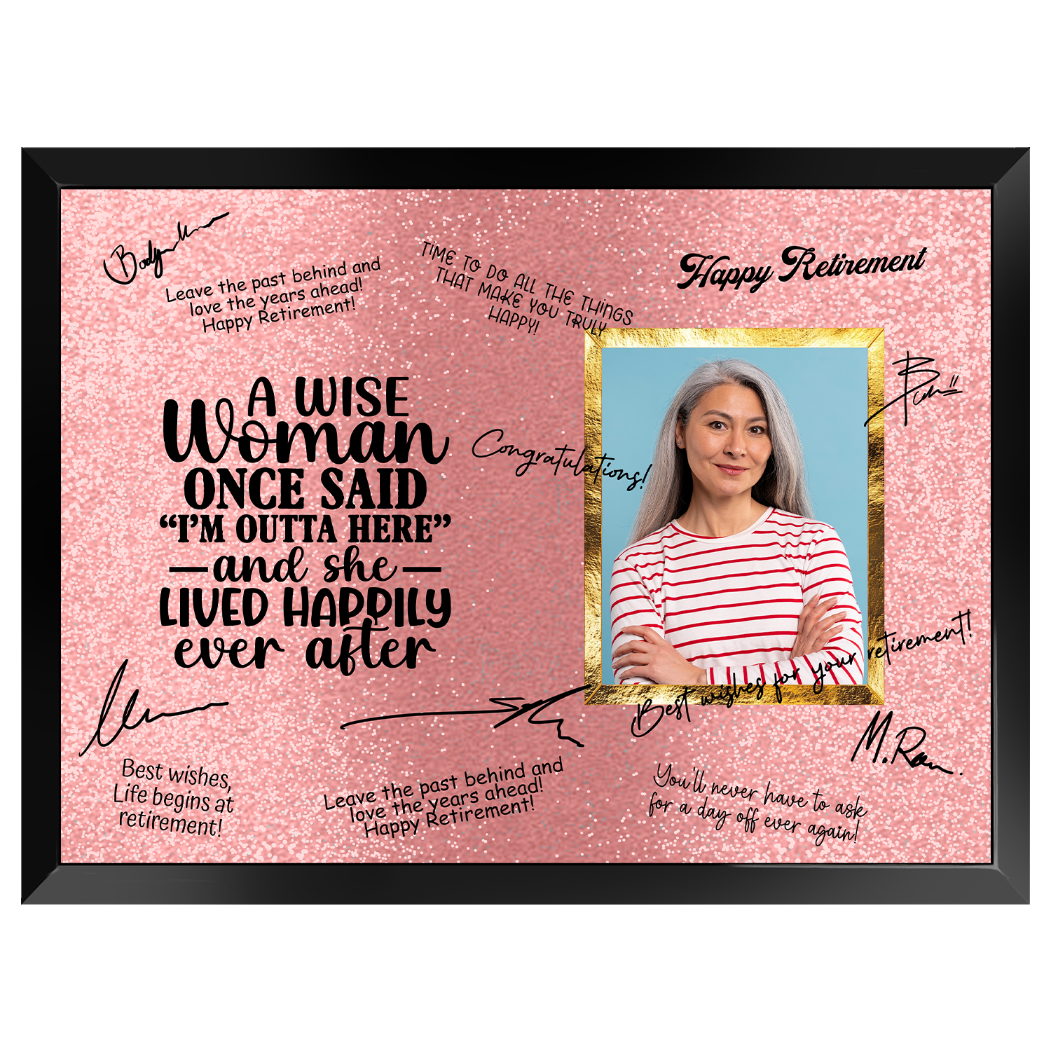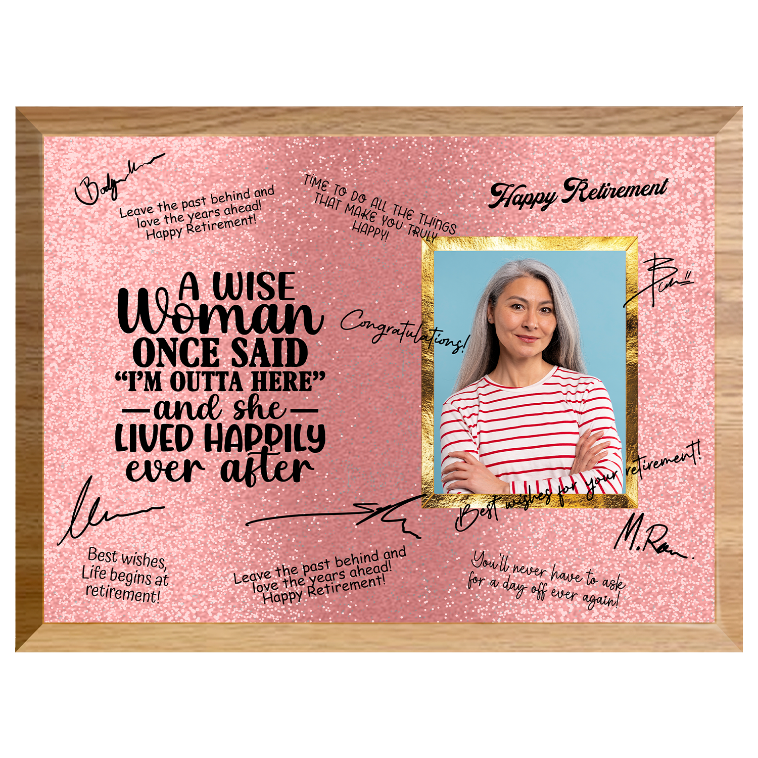 Each plaque includes a high-quality marker pen for easy signing, along with a customizable photo area to make it truly personal. With its vibrant, full-color print and elegant layout, it’s a perfect blend of humor and appreciation for her big send-off.