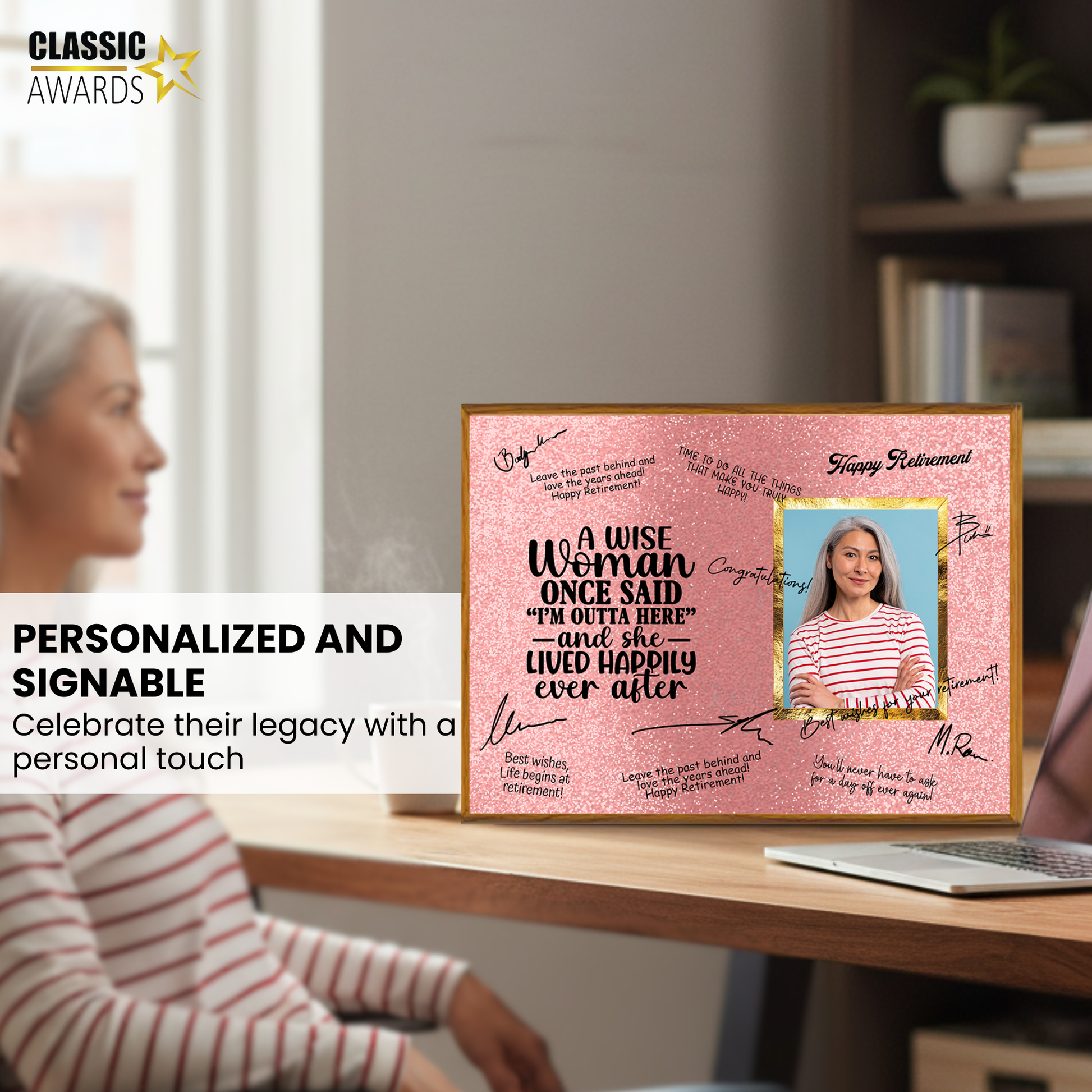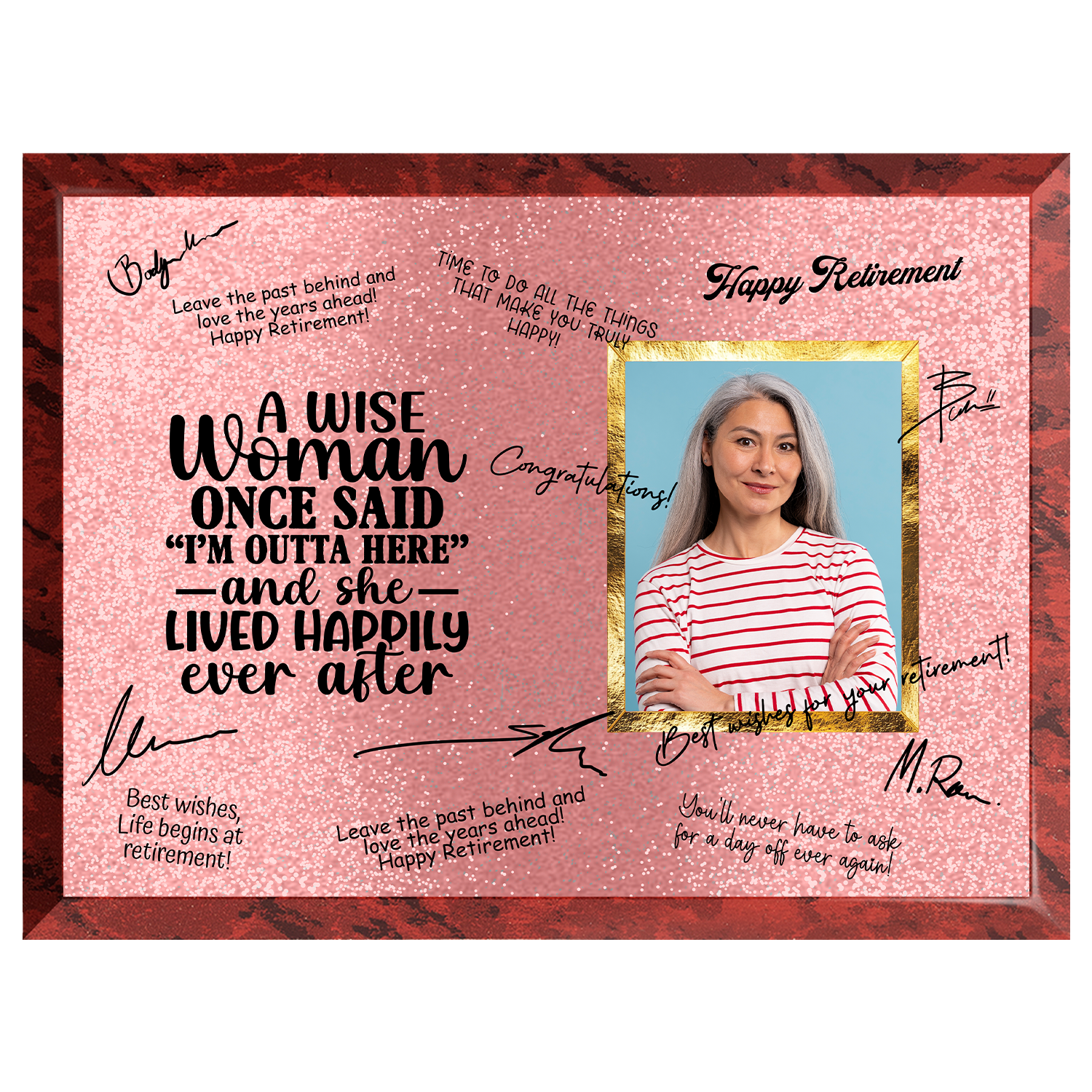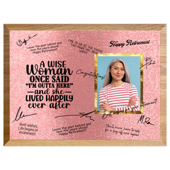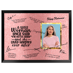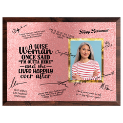 Celebrate her well-earned retirement with the “A Wise Woman” Retirement Plaque — a fun and heartfelt keepsake that captures years of dedication, laughter, and achievement. Featuring the playful quote “A Wise Woman Once Said ‘I’m Outta Here’ — And She Lived Happily Ever After,” this plaque is designed to be signed by coworkers, friends, and family, creating a one-of-a-kind memento she’ll treasure forever.