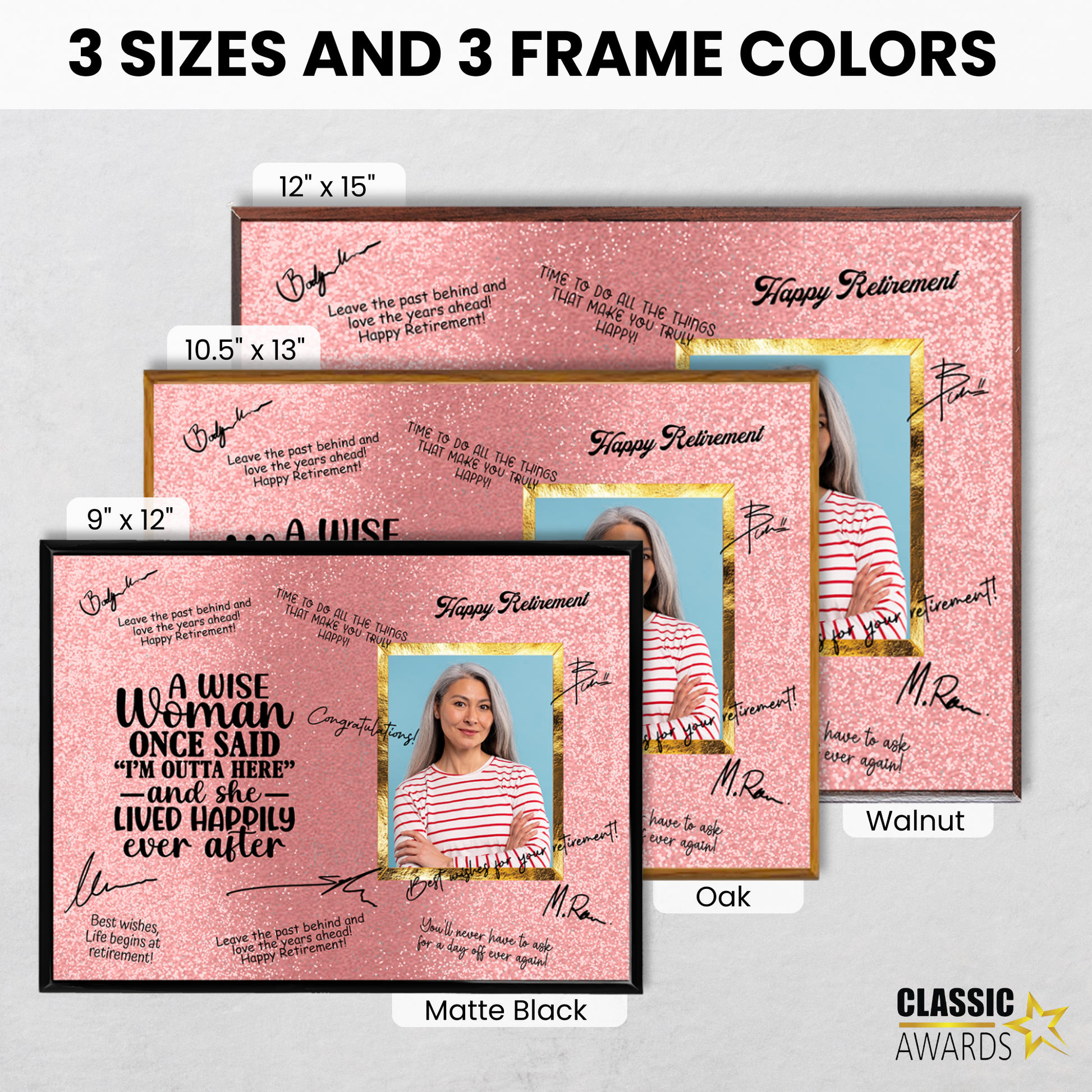 - Playful “A Wise Woman” retirement design with customizable photo area