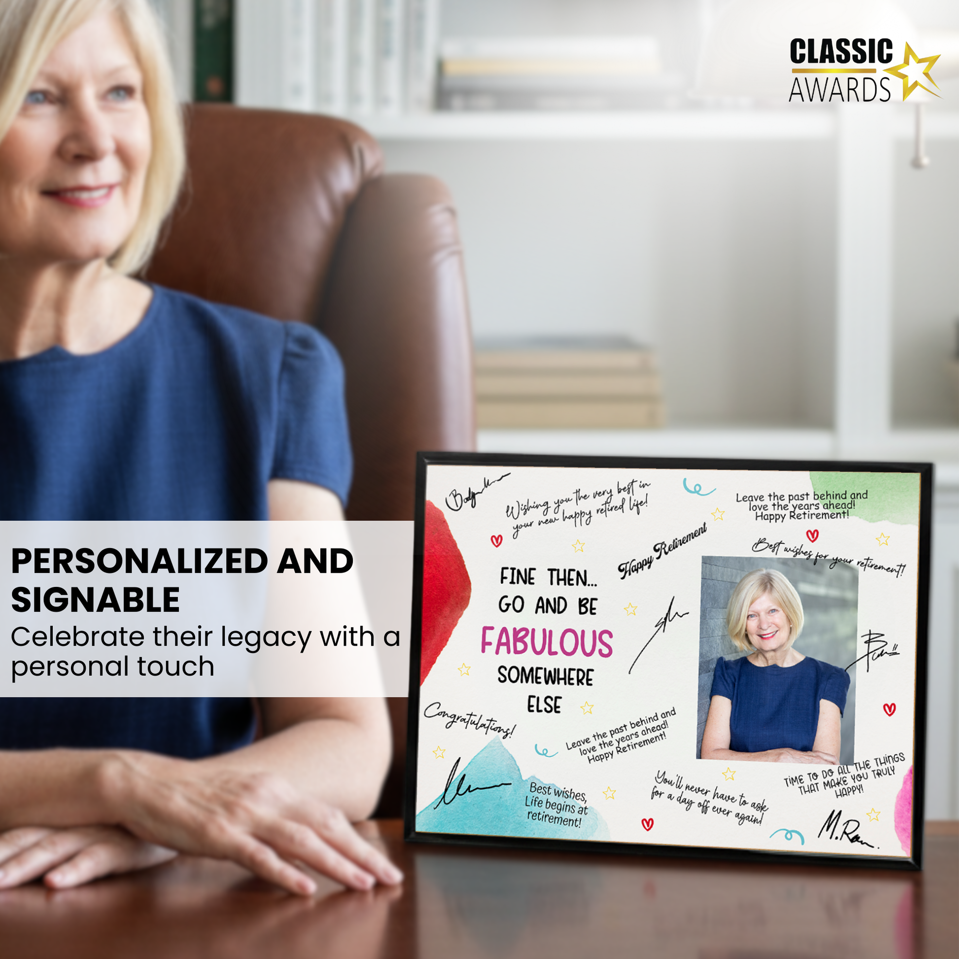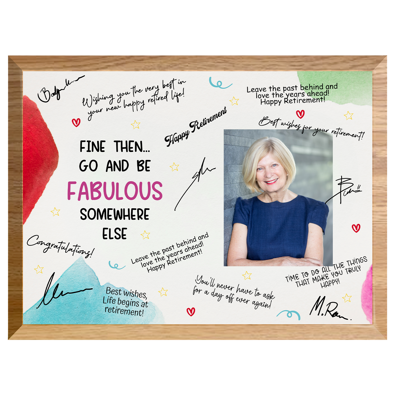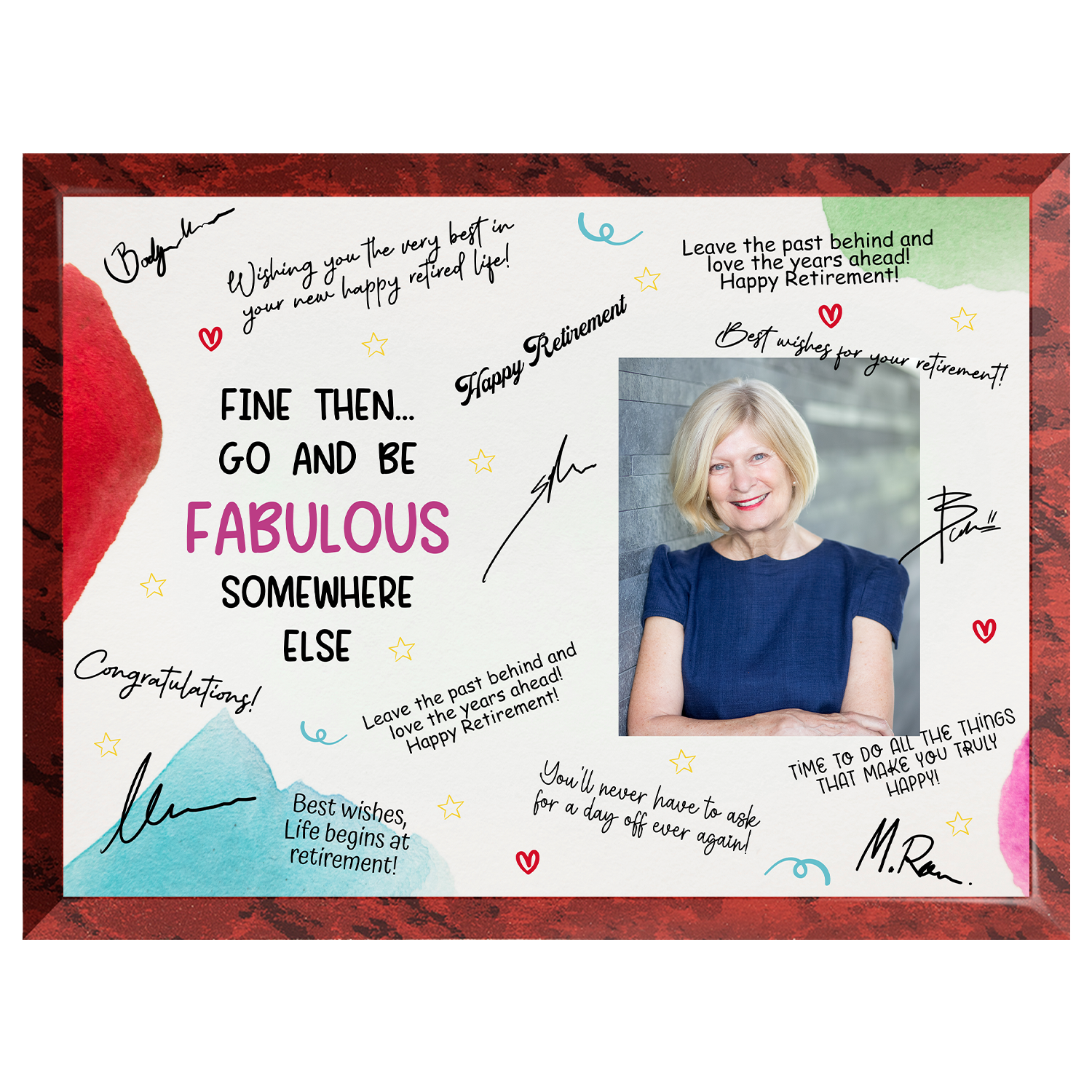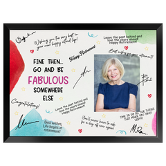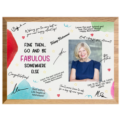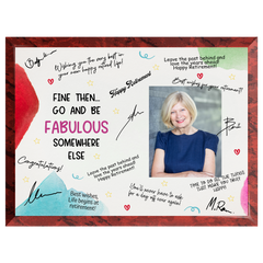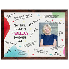 Send them off in style with the “Go & Be Fabulous” Retirement Plaque — a fun, elegant, and memorable way to celebrate their next chapter. This plaque is designed with space for coworkers, friends, and family to sign and share heartfelt messages, creating a one-of-a-kind keepsake filled with laughter and appreciation.