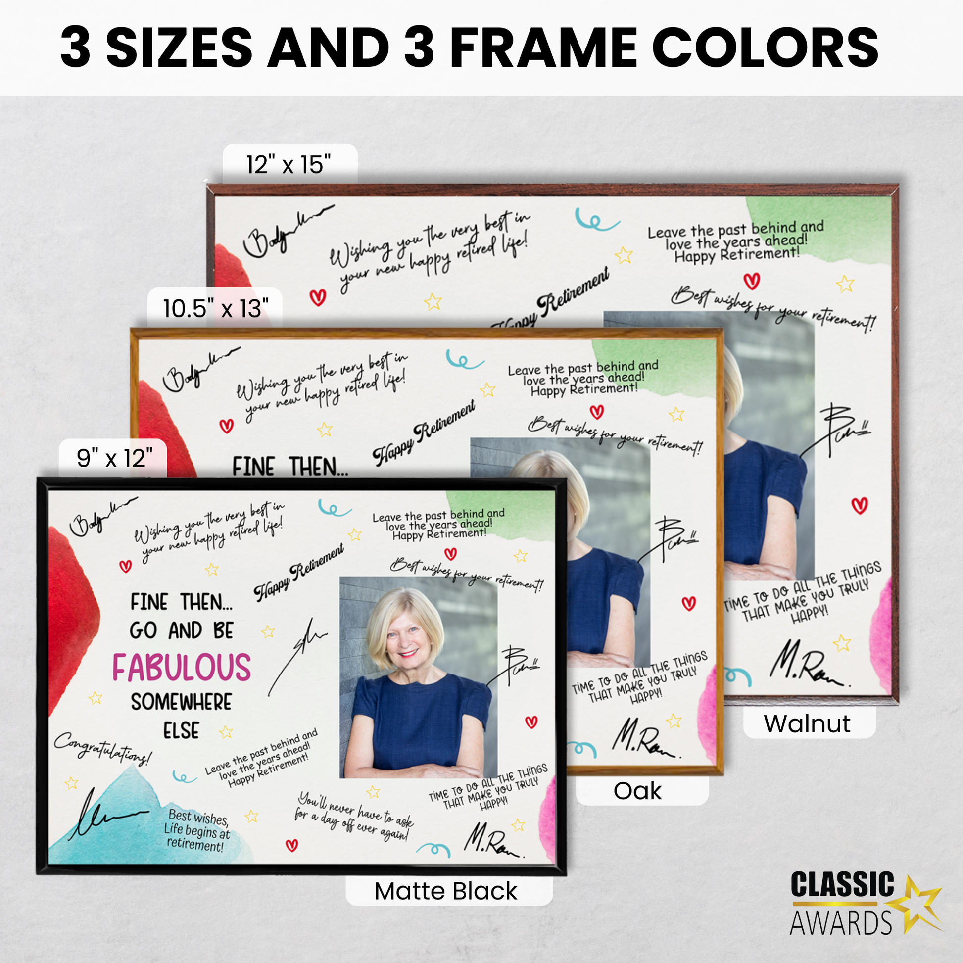 - Chic “Go & Be Fabulous” retirement theme with customizable photo area