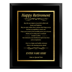 With a refined gold script and decorative accents on a classic black background, this plaque makes a timeless and meaningful gift. Each piece can be personalized with the retiree’s name, date, and an optional special note — creating a keepsake they’ll treasure for years to come.