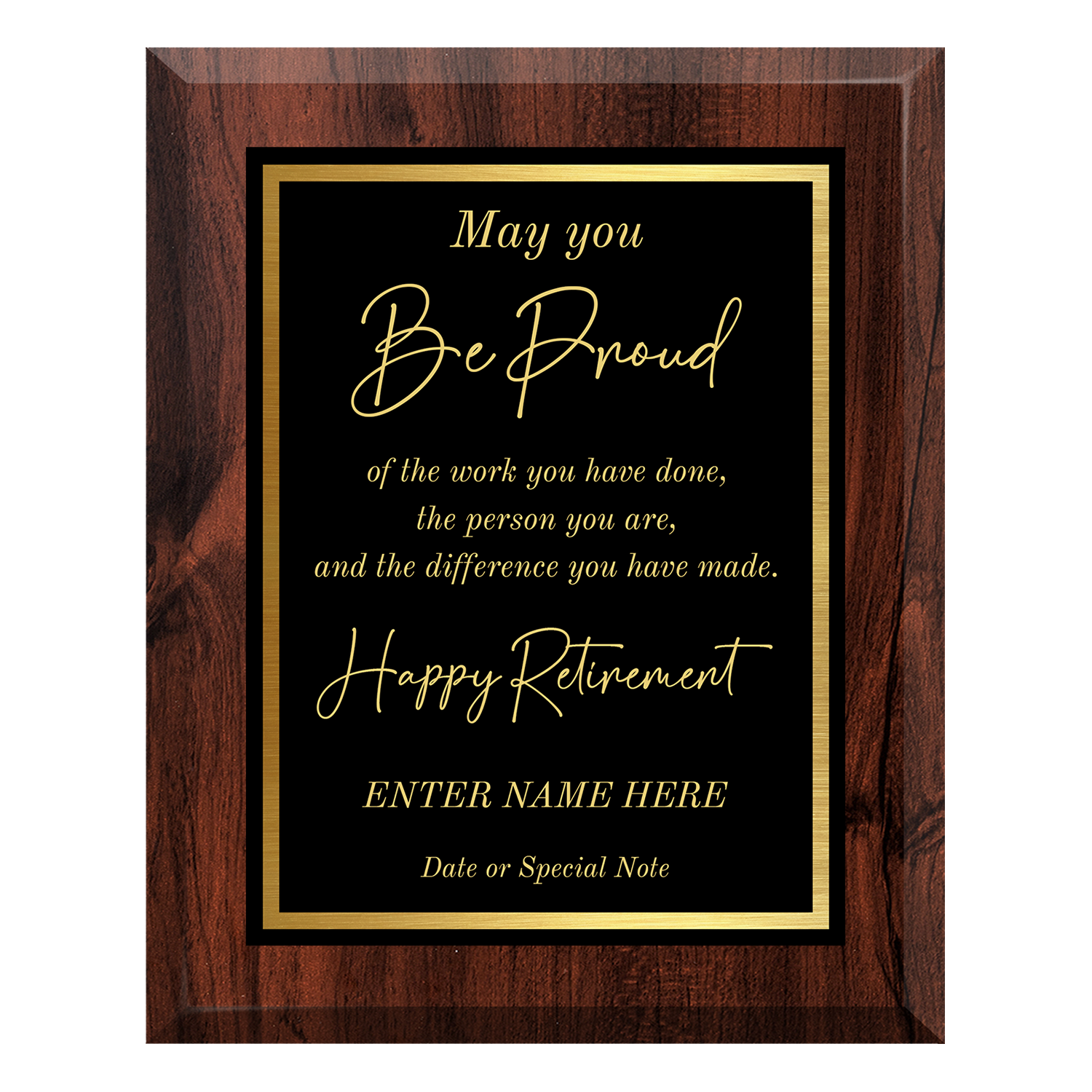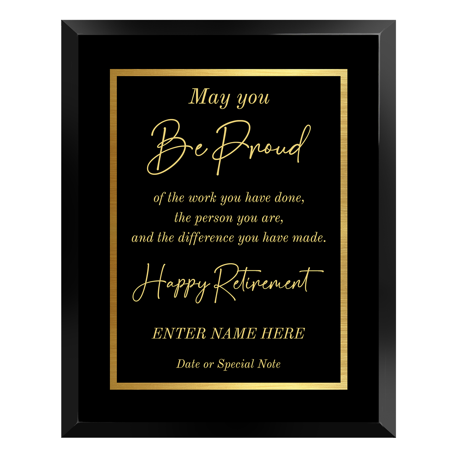 Celebrate a remarkable career with our May You Be Proud” Retirement Plaque, a heartfelt tribute to years of dedication, hard work, and impact. Featuring an elegant gold script design on a classic black background, this plaque captures the sentiment of appreciation and pride perfectly.