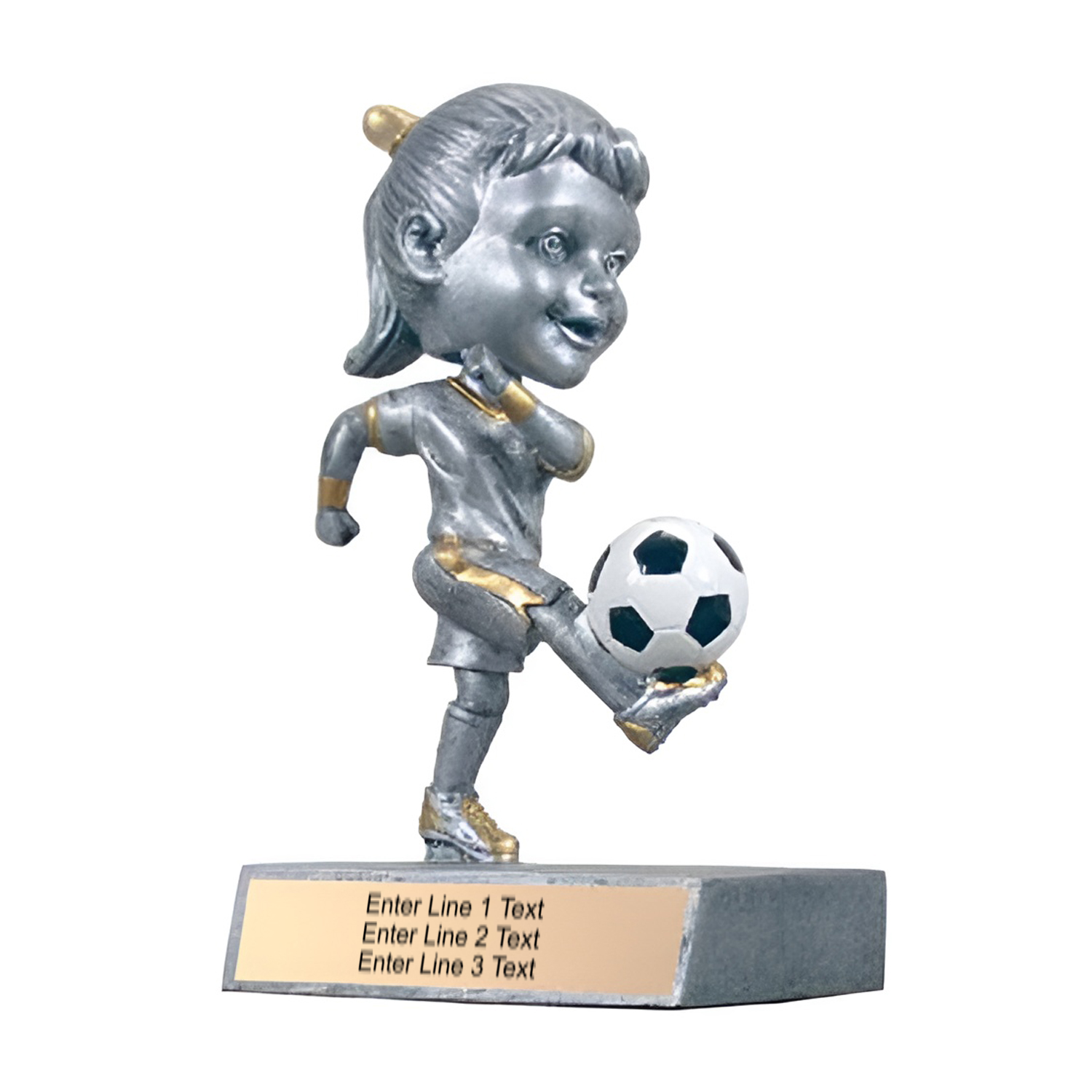 Celebrate achievement on the field with this fun and affordable soccer trophy. Featuring a dynamic player in action, this 5.5" resin bobble head stands on a sturdy base with a customizable engraving plate. Perfect for youth leagues, tournaments, or team celebrations, it’s a memorable keepsake that blends playful design with professional quality.