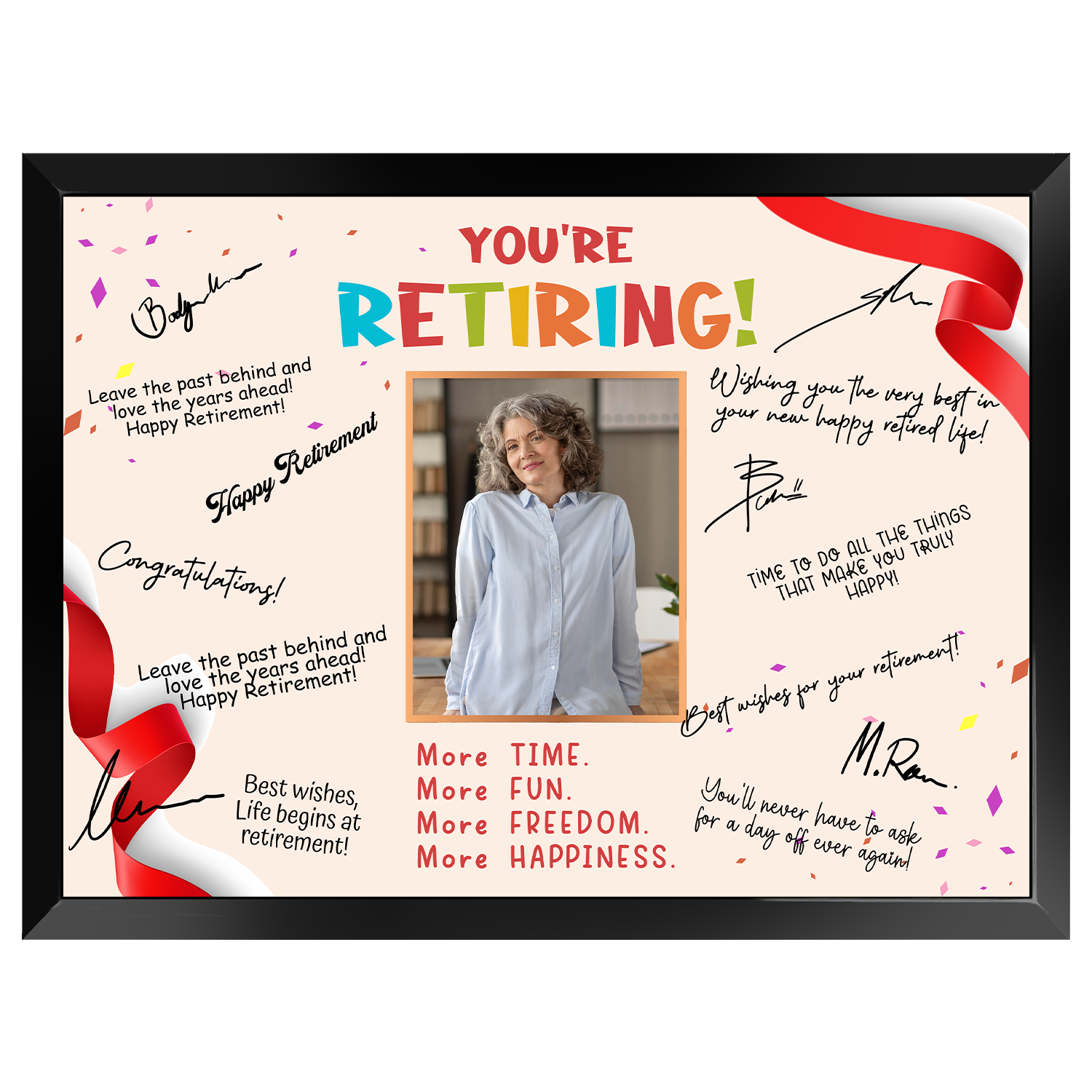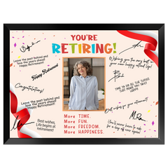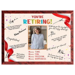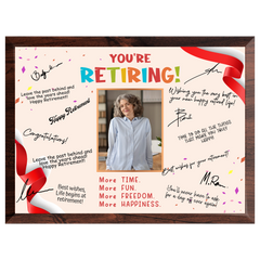 Bring joy, color, and laughter to their farewell with the “You’re Retiring!” Signature Plaque — a vibrant and heartwarming keepsake designed for coworkers, friends, and family to sign. Featuring a cheerful design bursting with positivity and a customizable photo area, this plaque perfectly captures the excitement of retirement and the happiness that comes with new beginnings.